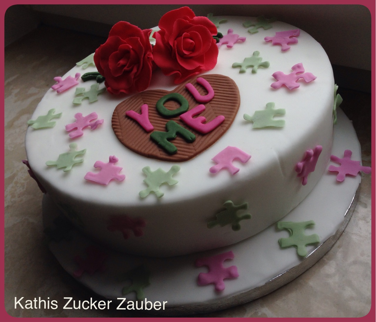 Den Weißen habe ich auch zu Testzwecken mit CMC gemischt und einen Teil eingefärbt, ich war mit dem Ergebnis sehr zufrieden. Es liess sich damit super arbeiten und modelieren. Ich habe daraus die Rosen gemacht. Mit den anderen weißen gemischten Teil habe ich jeweils etwas genommen und mit den anderen Farben vermischt um damit meine Deko (Puzzelteilchen und Herz) herzustellen. Die Buchstaben auf dem Herz sind aus dem normalen Rollfondant.