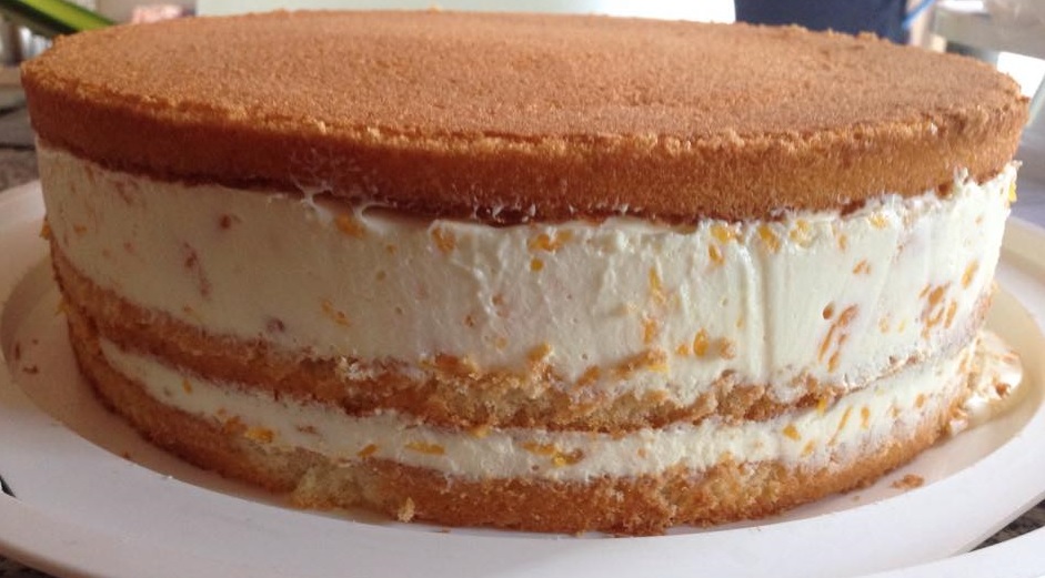 Biskuitteig gefüllt mit Mandarinen-Mascarpone-Creme ummantelt mit einer Zartbitterganache, verziert mit Fondant.