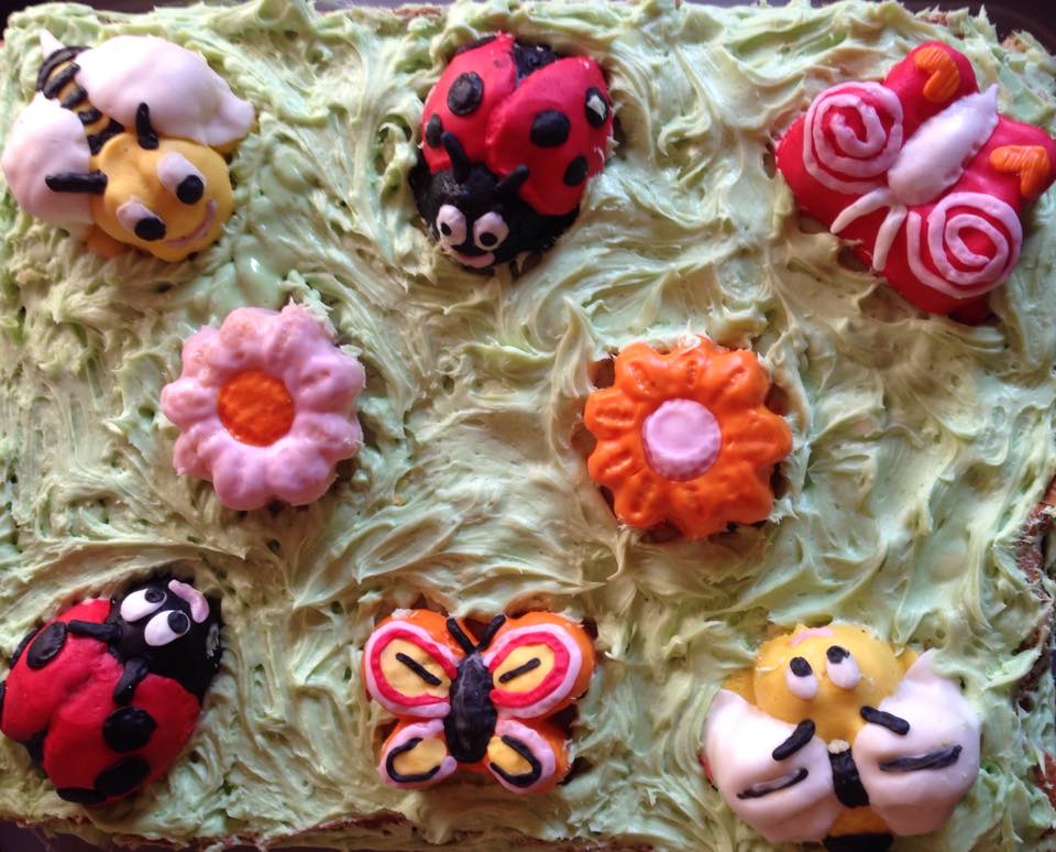 Biskuitböden gefüllt mit einer Limetten-Yoguretten-Creme, Wiesenbewohner sind aus Rührteige gefertigt und nur mit Fondant verziert und sitzen auf er einer Grünen-Weißen-Vollmilchschokoladen-Ganache.