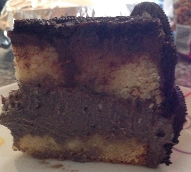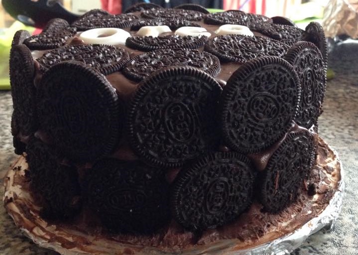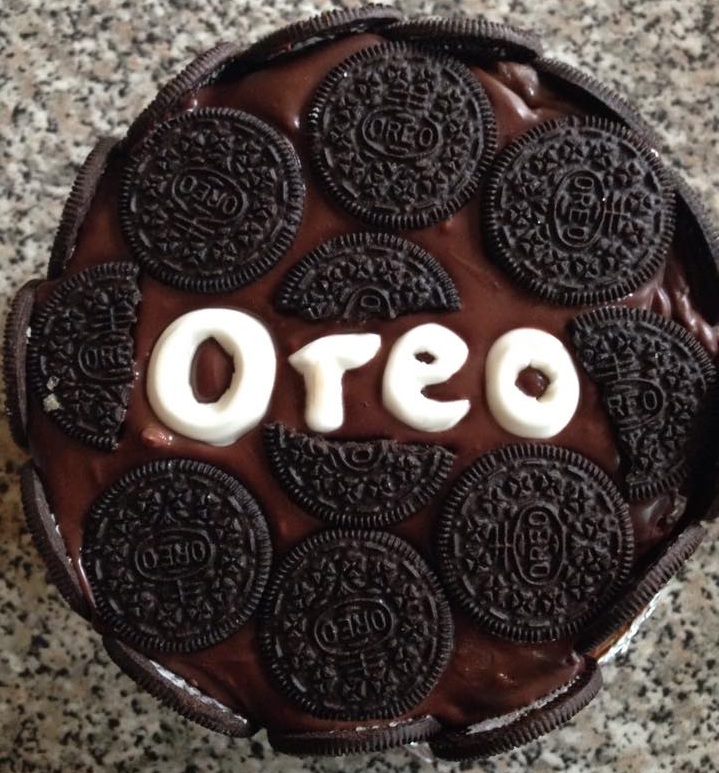 Oreo-Torte, bestehend aus Biskuitteig mit einer Füllung aus den Oreo-Keksen vermischt mit Mascarpone, ummantelt mit Zartbitterganache, verziert mit den Oreo-Keksen. Schriftzug “Oreo” ist aus Fondant gefertigt.