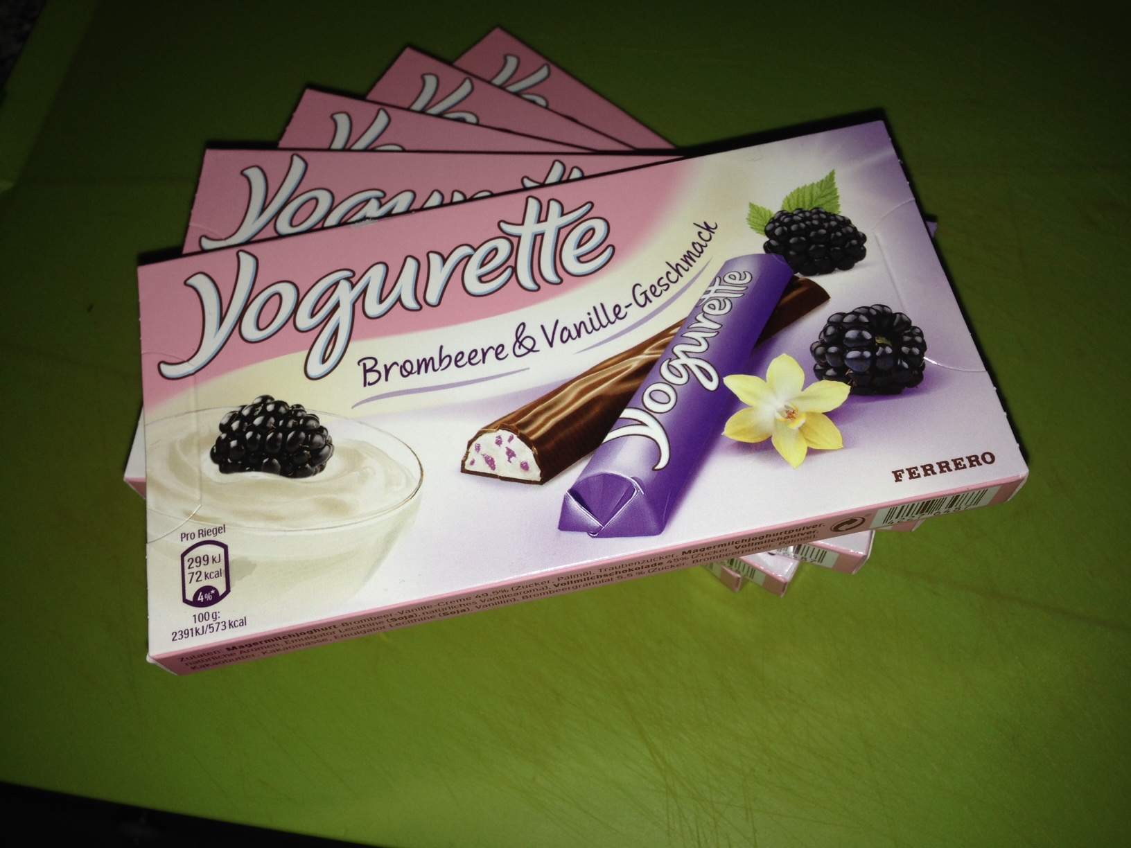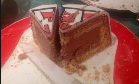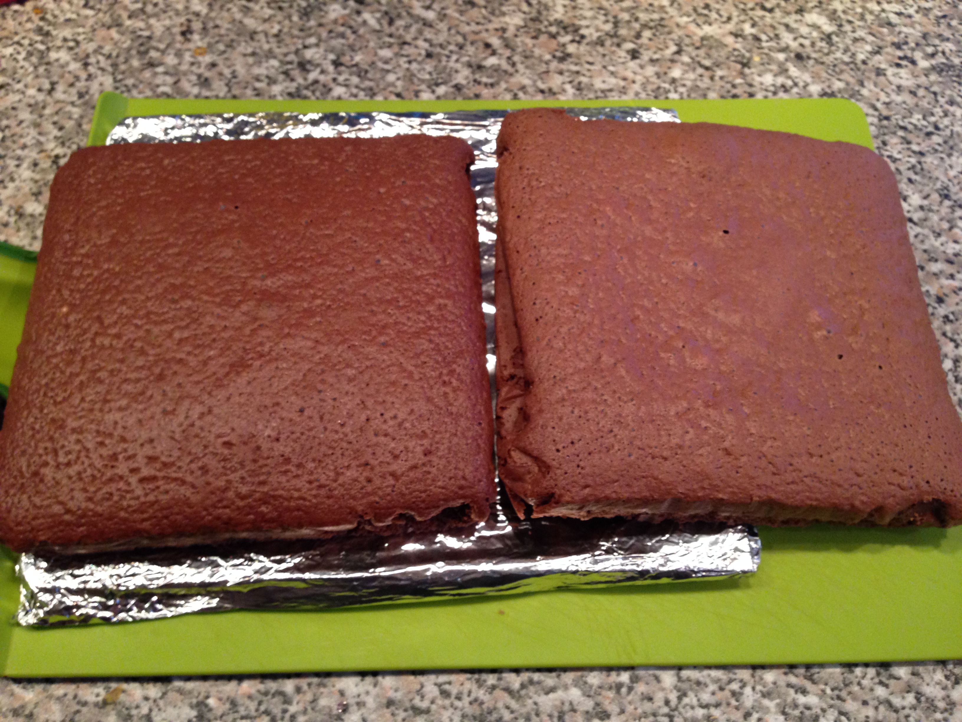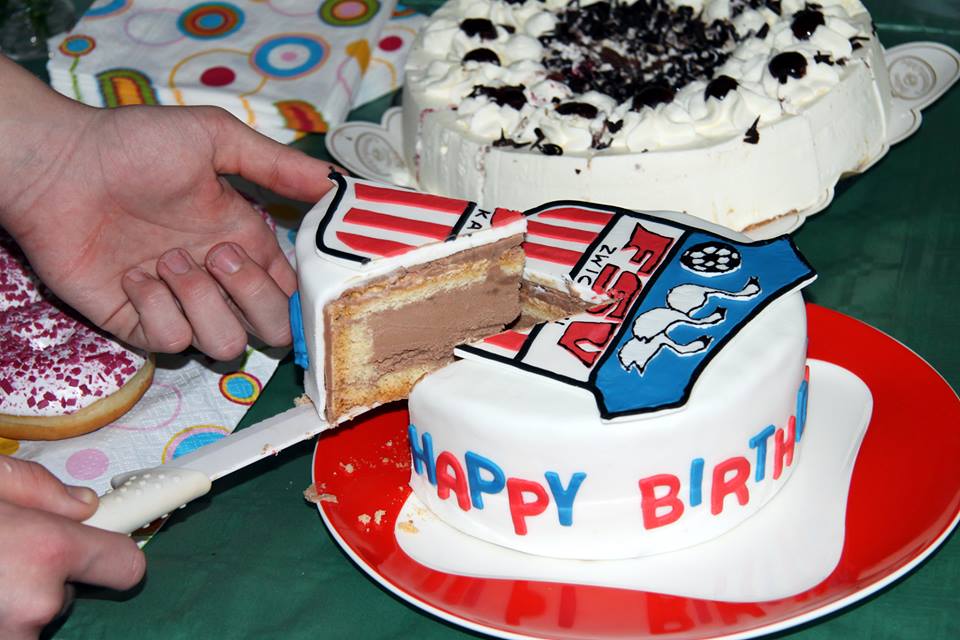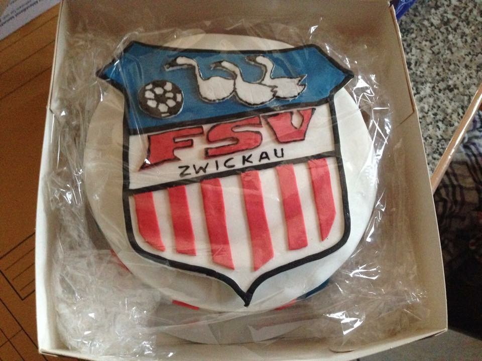 Alles klar, raus gekommen ist ein Biskuitboden gefüllt und ummantelt mit einer Yoguretten-Ganache, als Tortenaufleger gibt es die zwei Logos der Vereine mit etwas Dekor.
