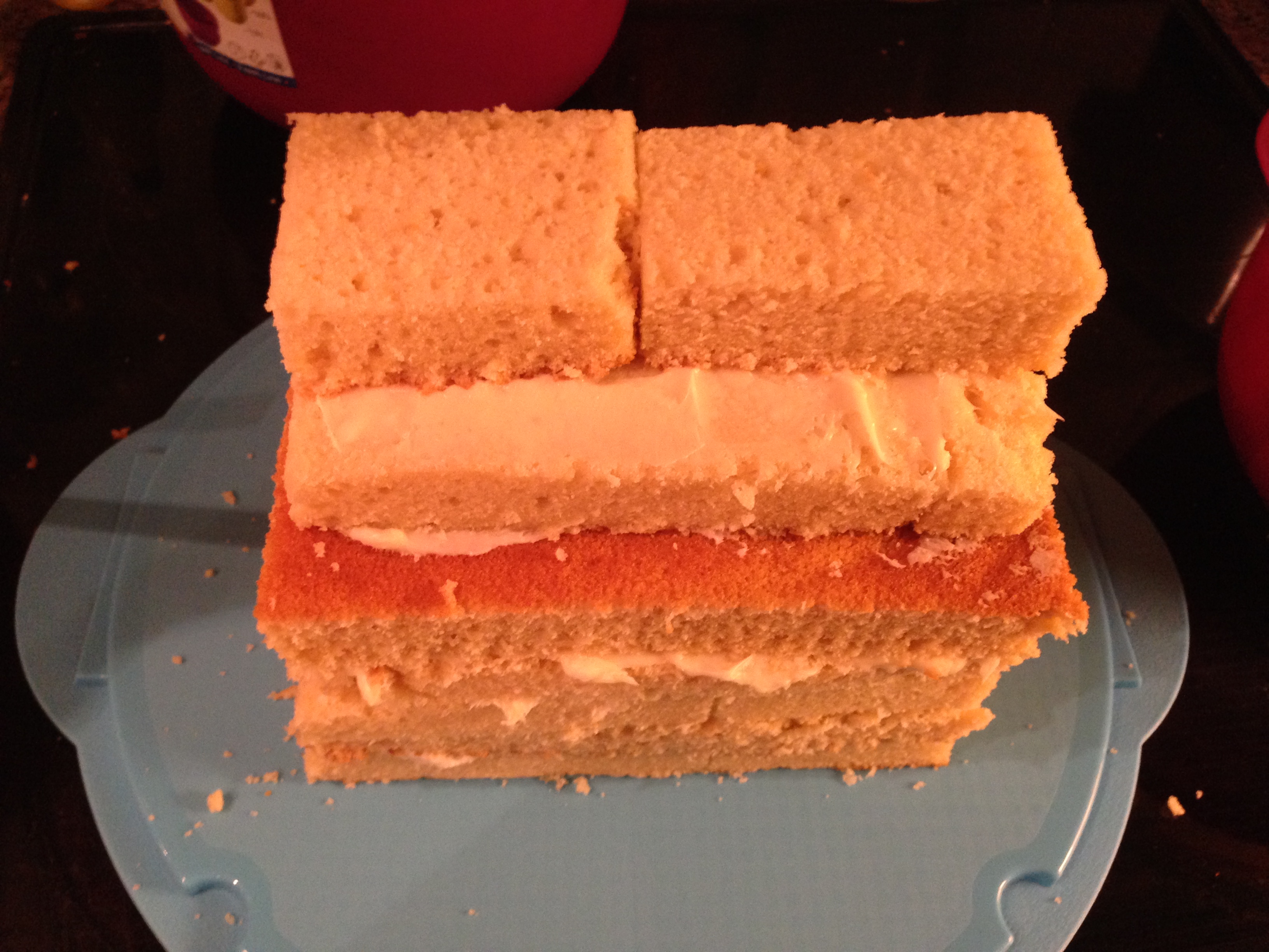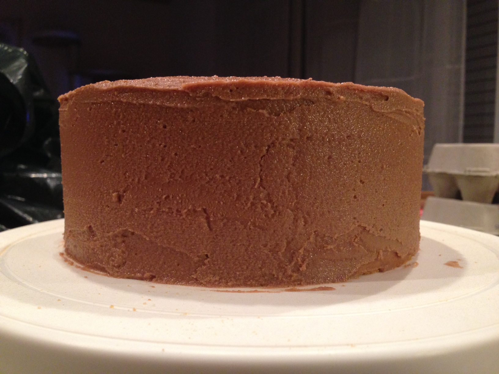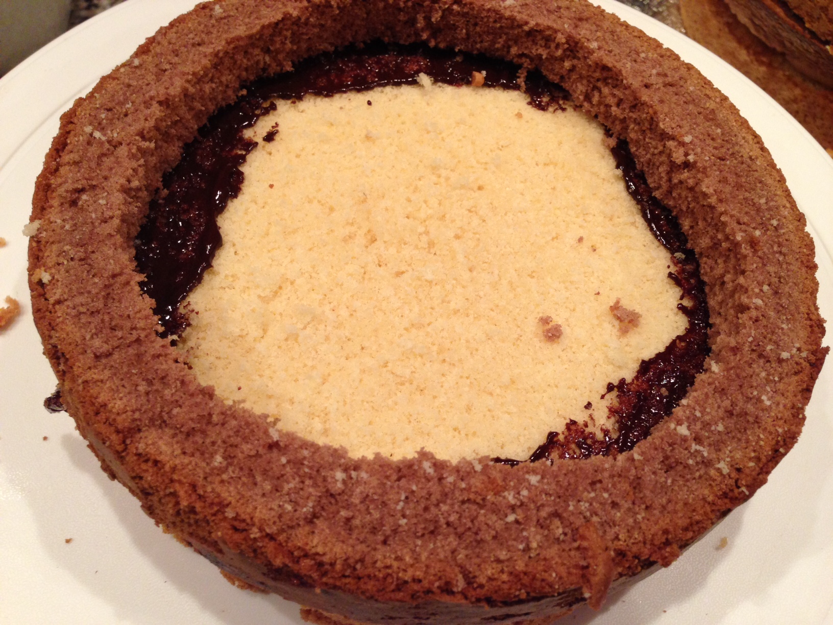 Alles klar, raus gekommen ist ein Biskuitboden gefüllt und ummantelt mit einer Yoguretten-Ganache, als Tortenaufleger gibt es die zwei Logos der Vereine mit etwas Dekor.