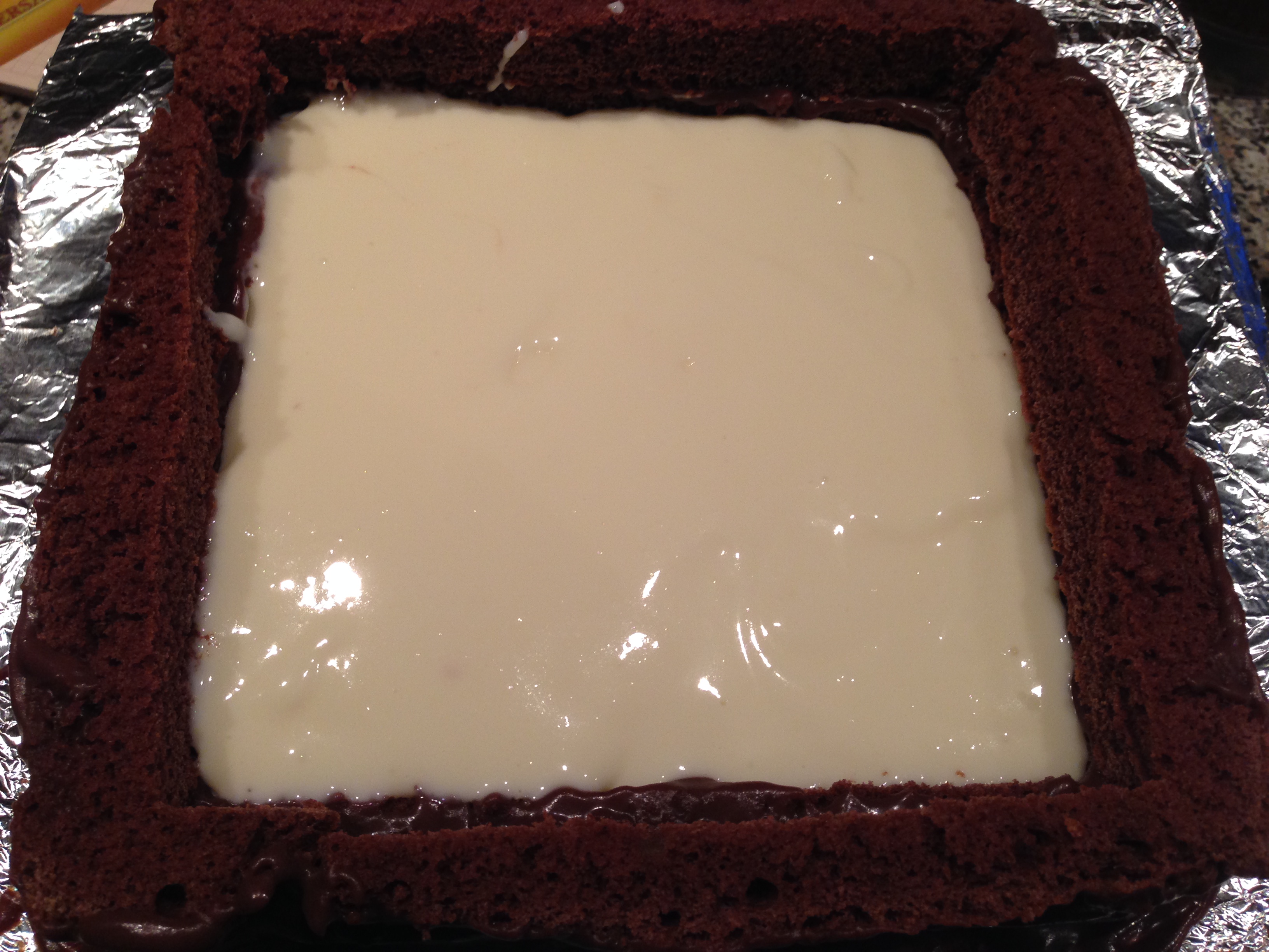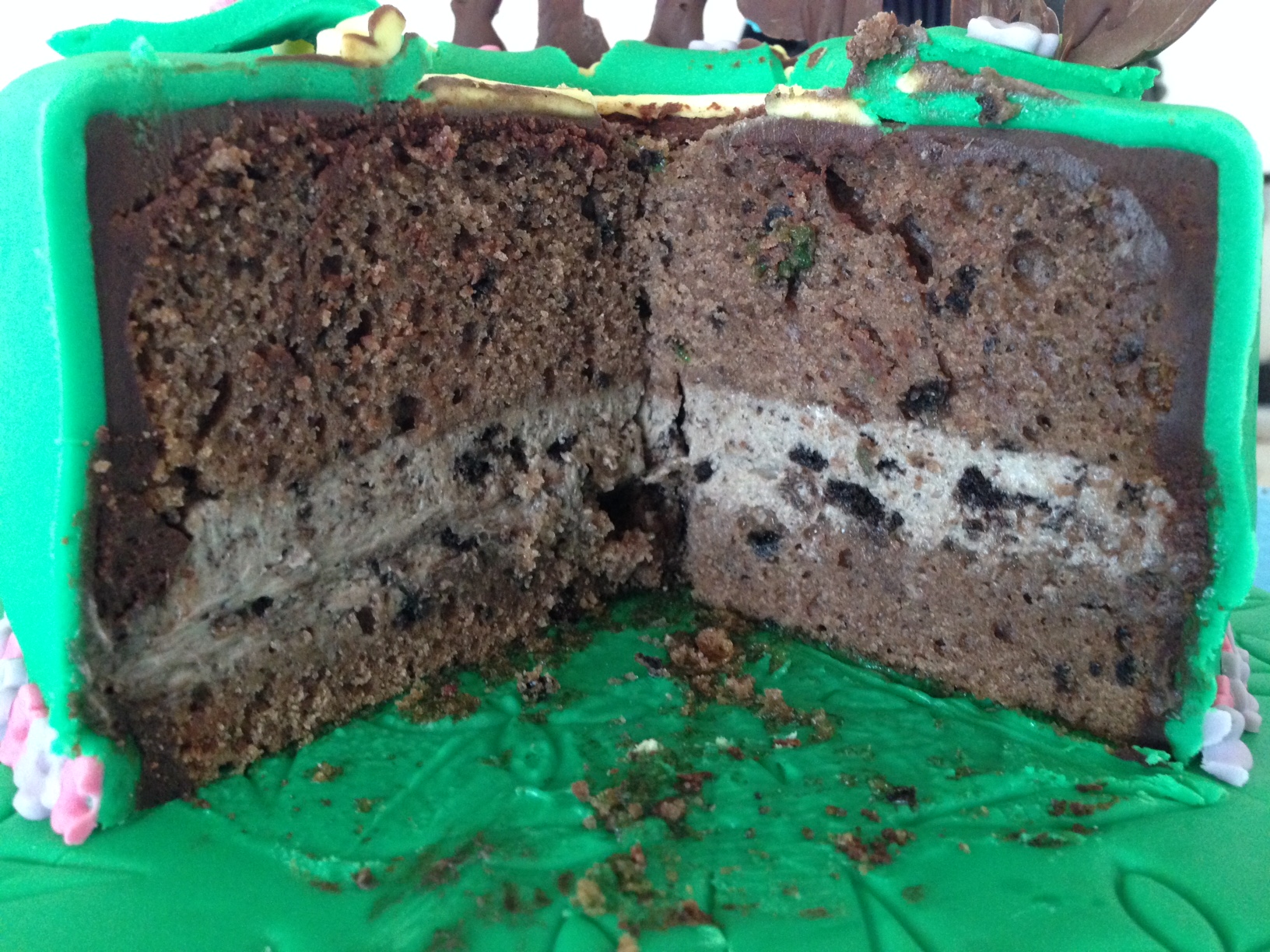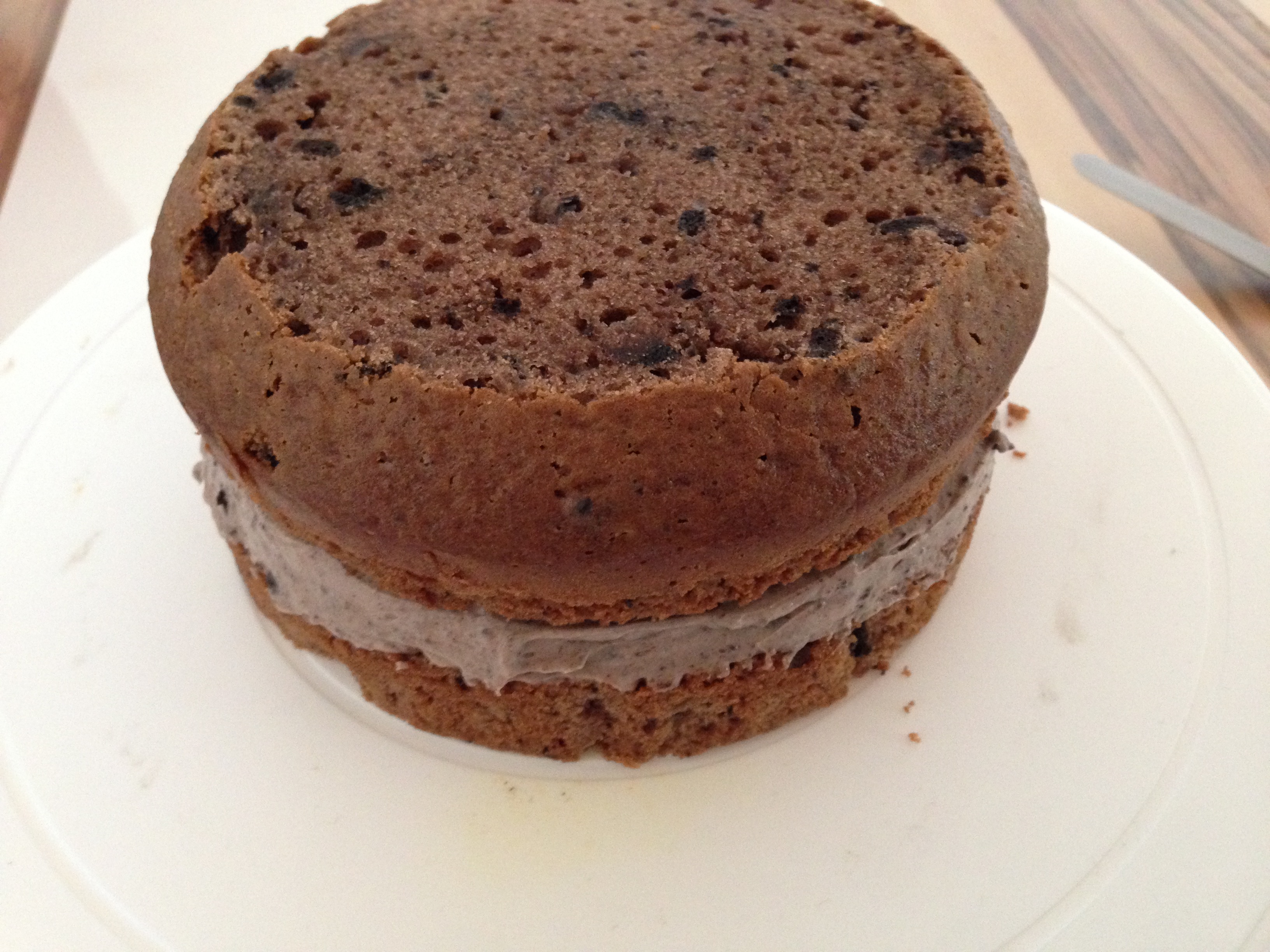 Schoko-Wunderkuchen mit Oreos gefüllt mit einer Oreo-Frischkäse-Creme und eingestrichen mit Zartbitterganache.