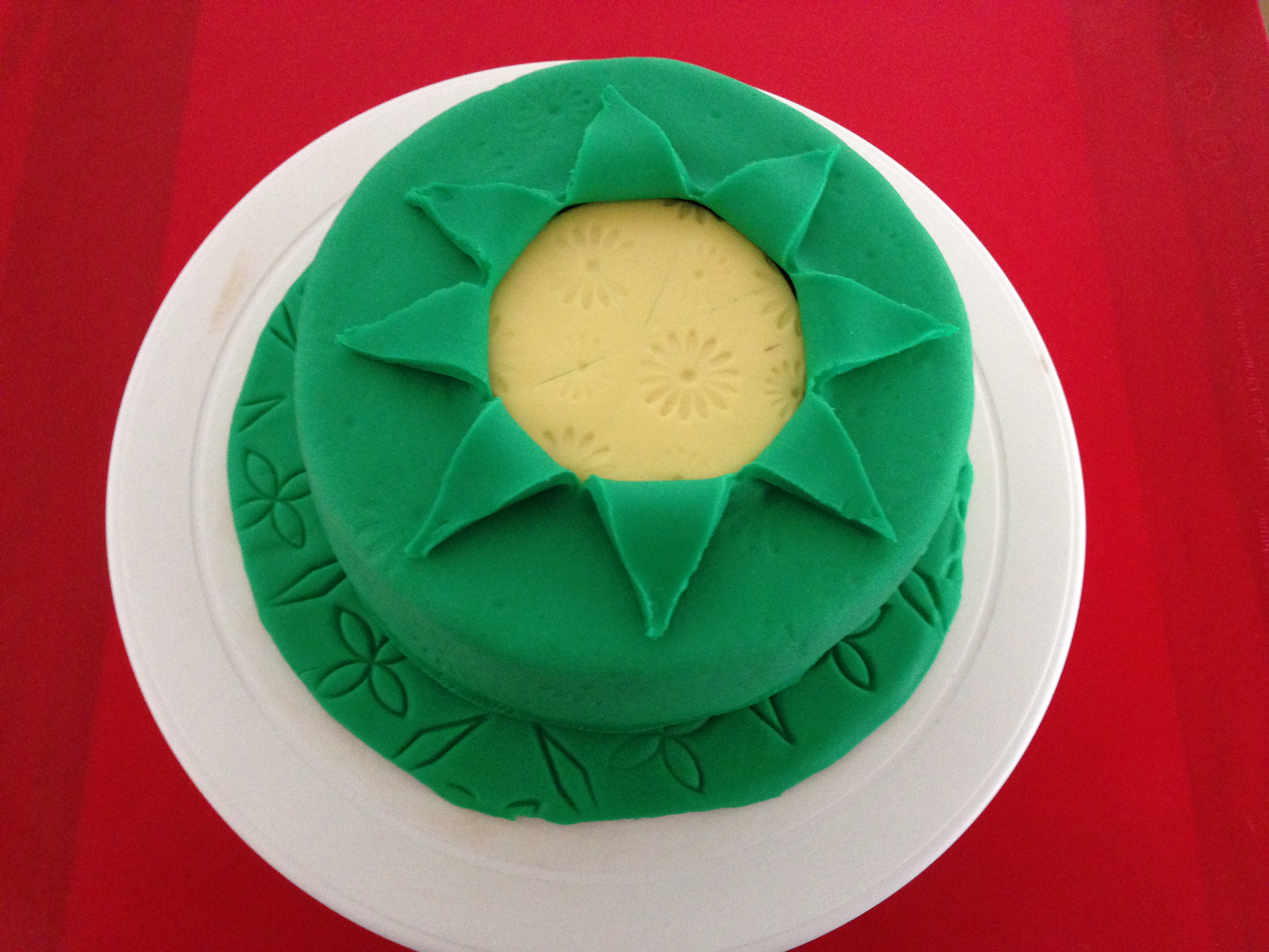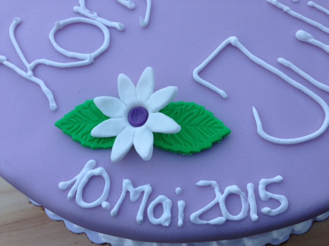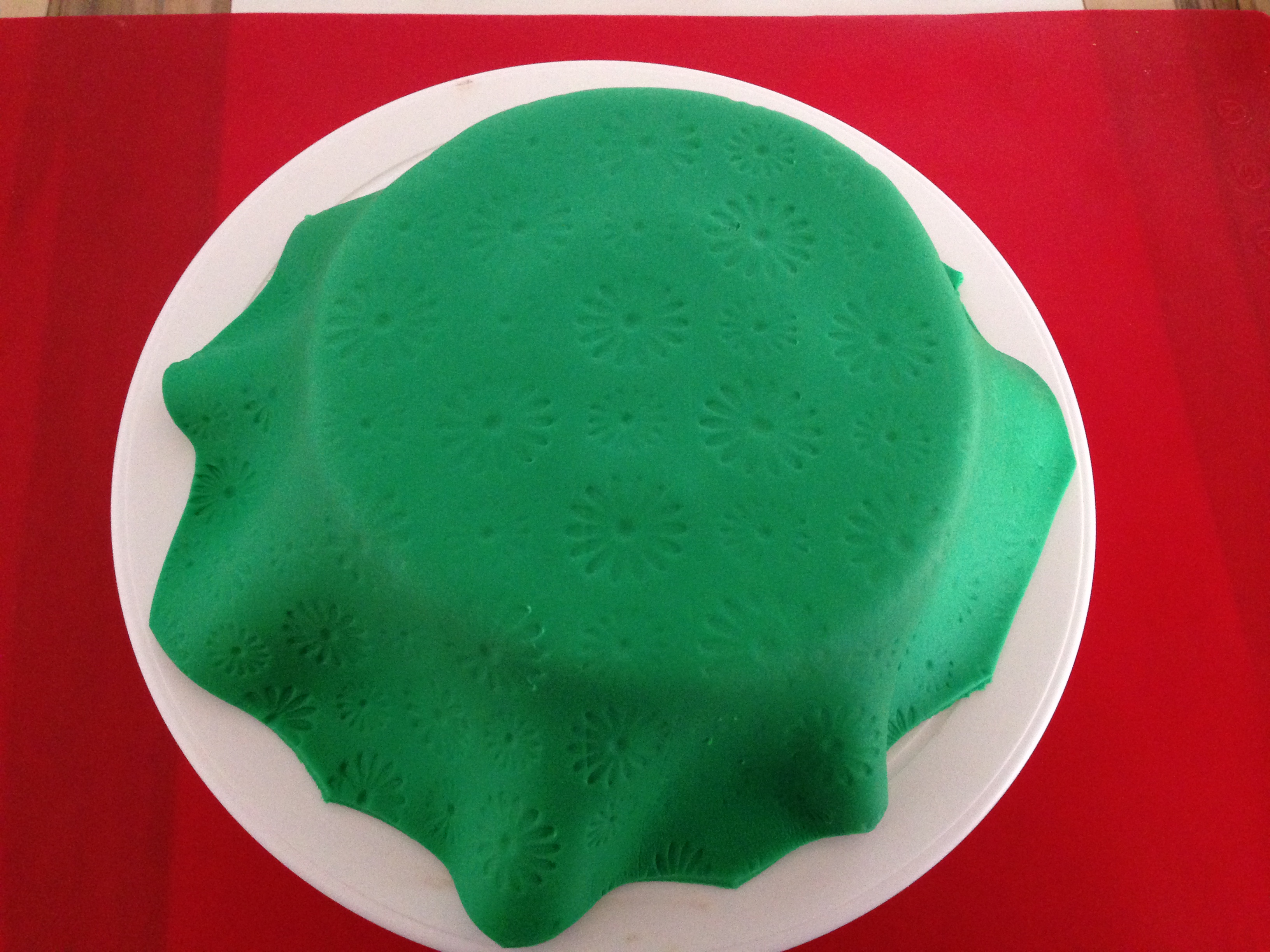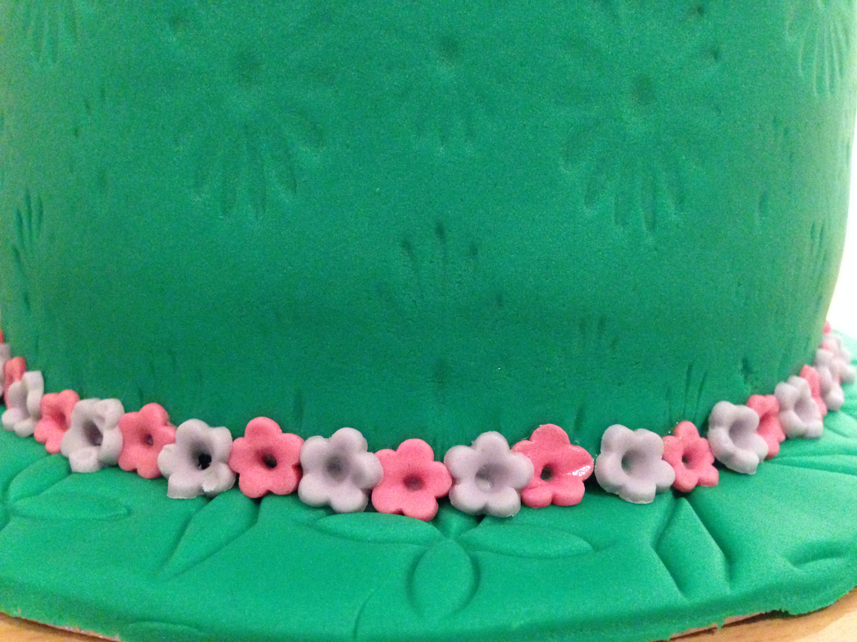 Eingedeckt mit grünem Rollfondant, der mit zwei Strukturrollen bearbeitet wurde, verziert mit ca. 60 Blümchen in rosa, violette und gelb.
