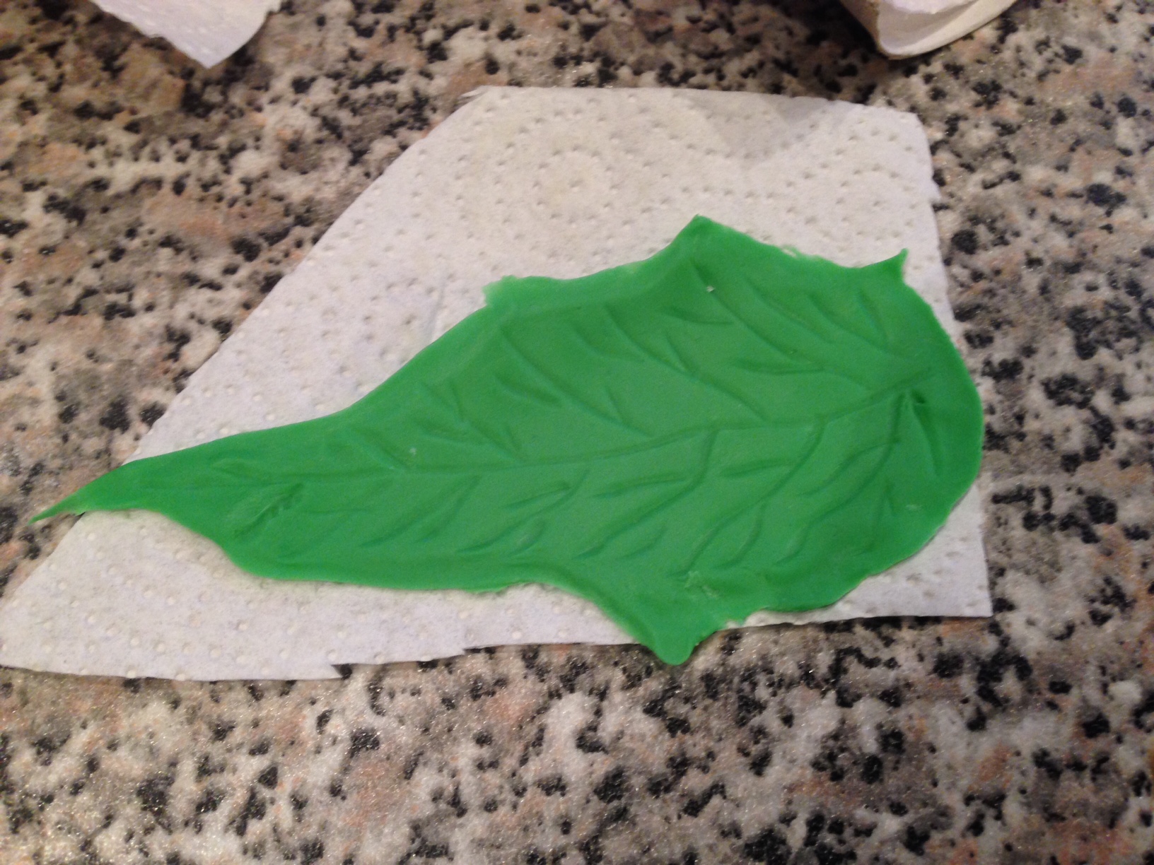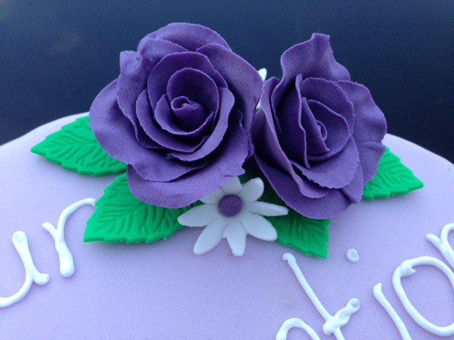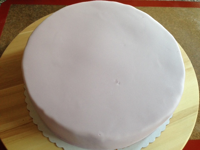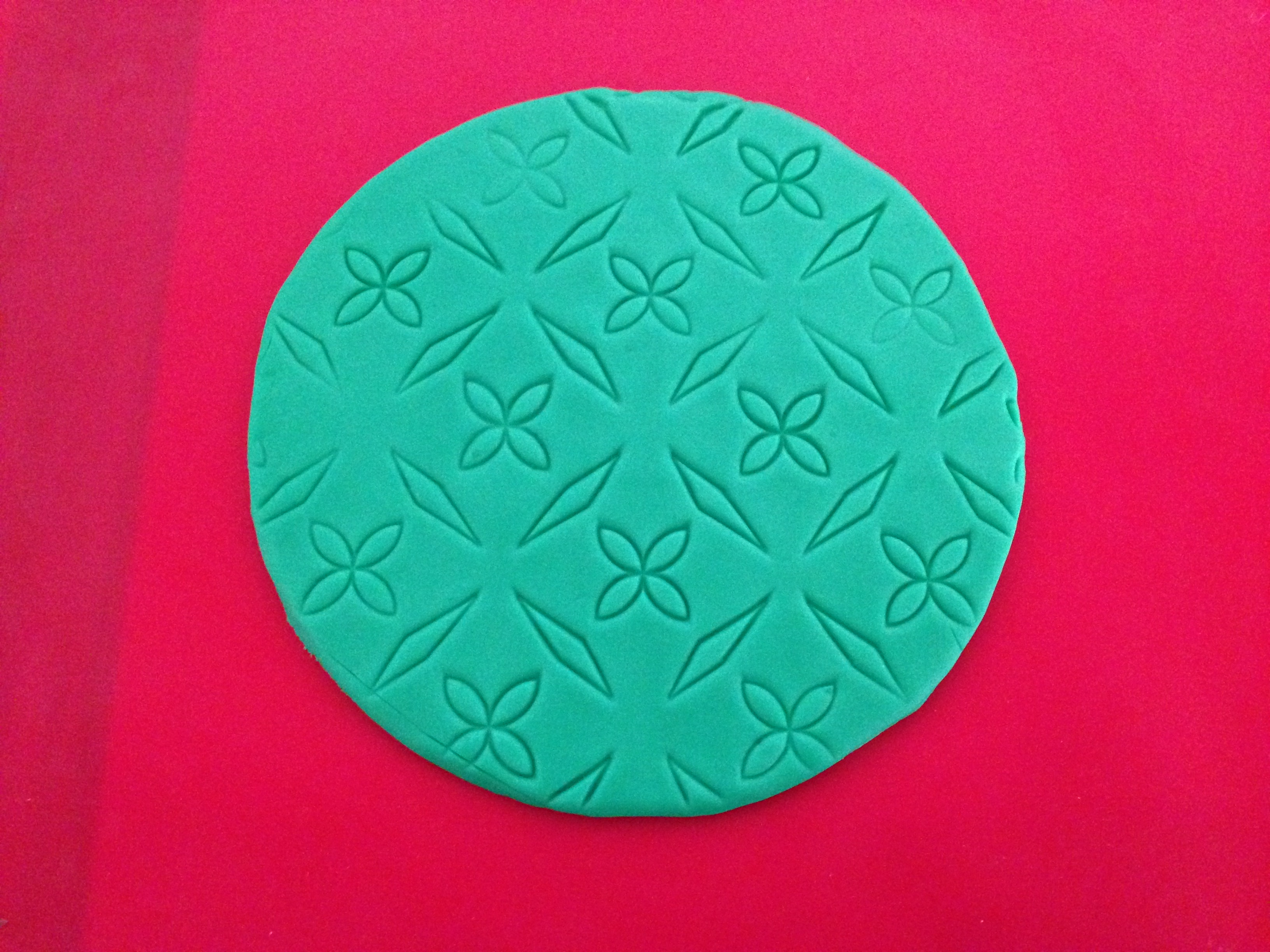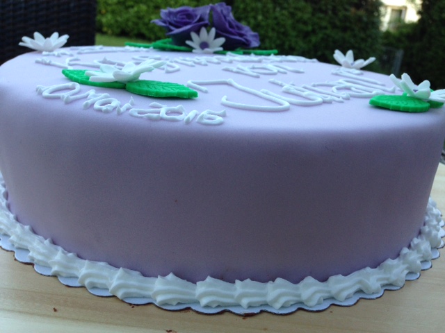 Eingedeckt mit grünem Rollfondant, der mit zwei Strukturrollen bearbeitet wurde, verziert mit ca. 60 Blümchen in rosa, violette und gelb.