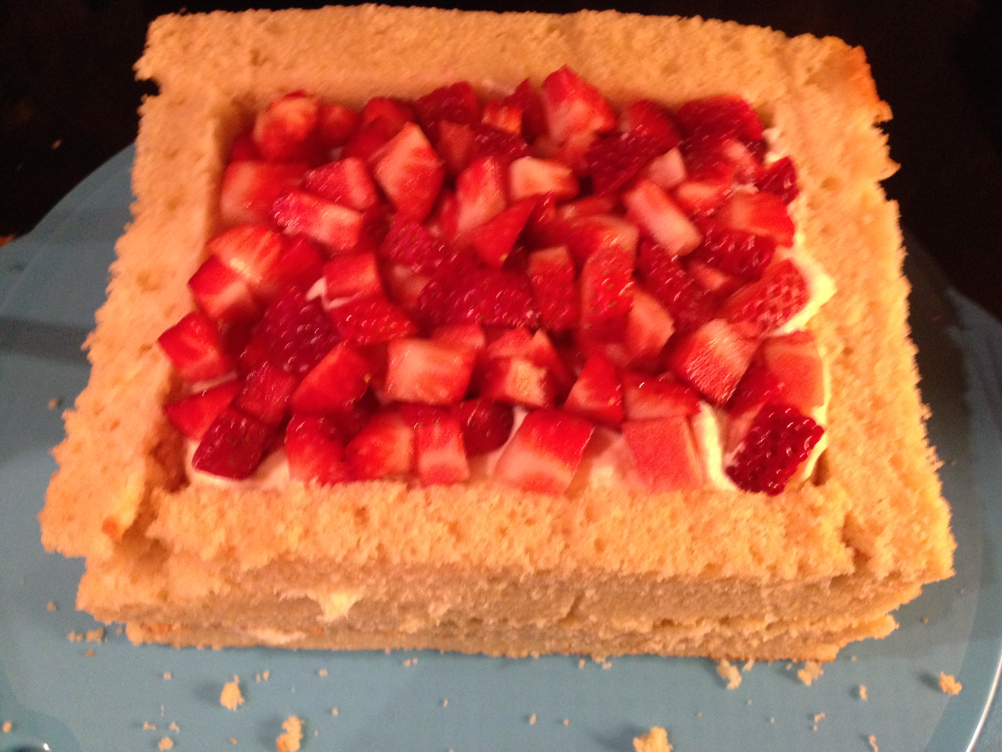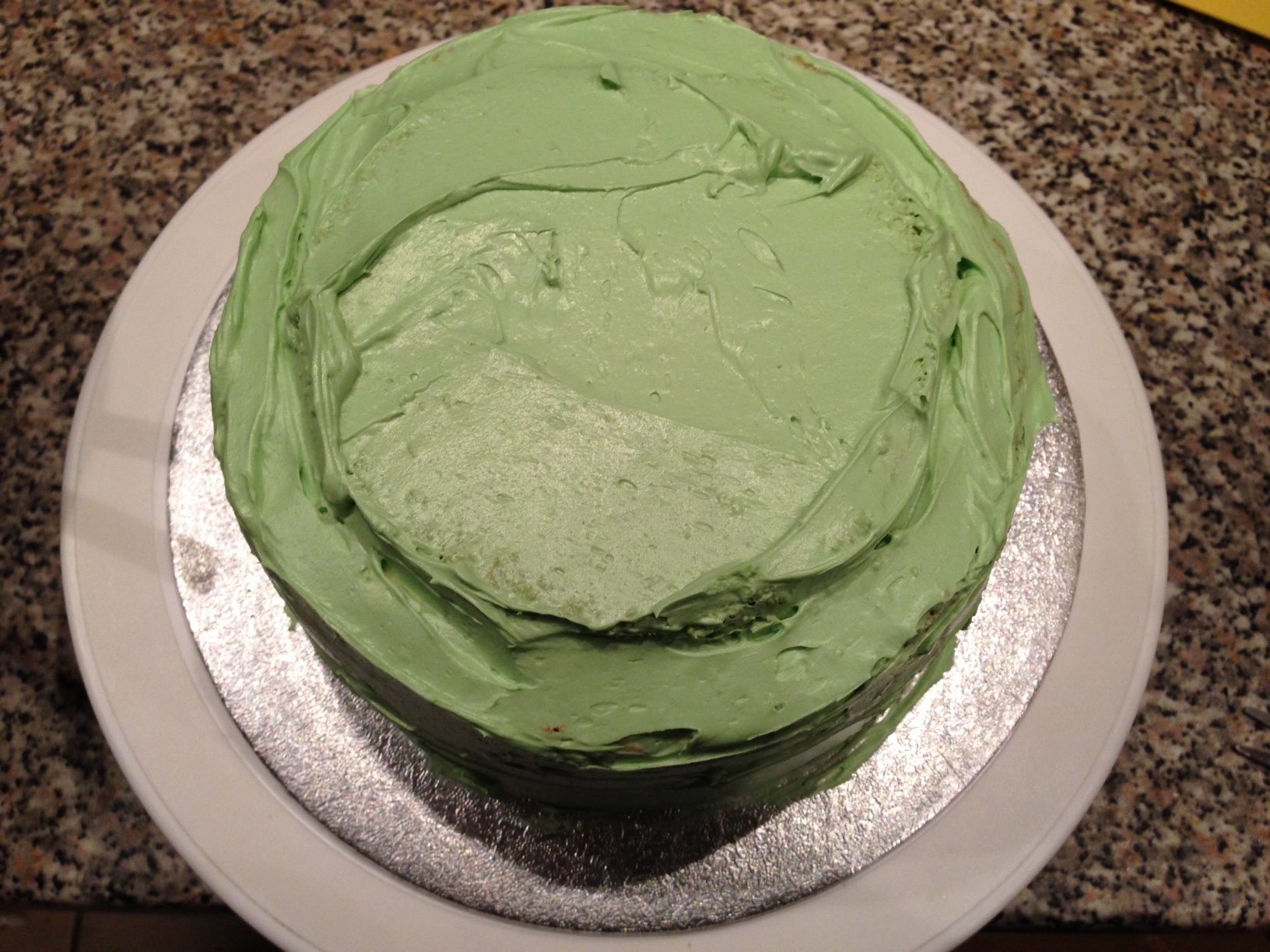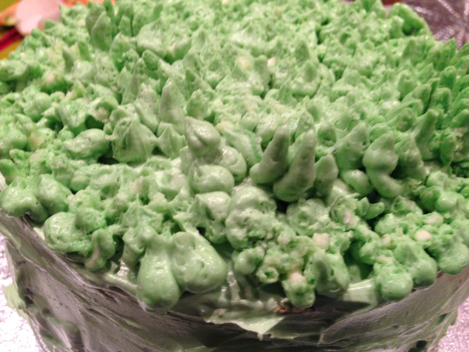 Der Boden ist ein Biskuitboden gefüllt mit zwei Fruchtschichten, die erste bestehend aus Erdbeeren & Himbeeren; die zweite aus Mandarinen & Ananas, dazwischen ist eine Frischkäse-Sahne-Creme. Die Schokoladenbuttercreme besteht aus Weißer Schokolade, Sahne, Butter, Puderzucker und grüner Lebensmittelfarbe, gespritzt mit einer Grastülle/Mehrlochtülle. Die Veilchen und Schmetterlinge sind aus Blütenpaste gefertigt und bemalt.