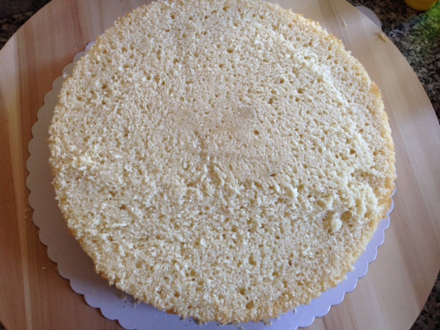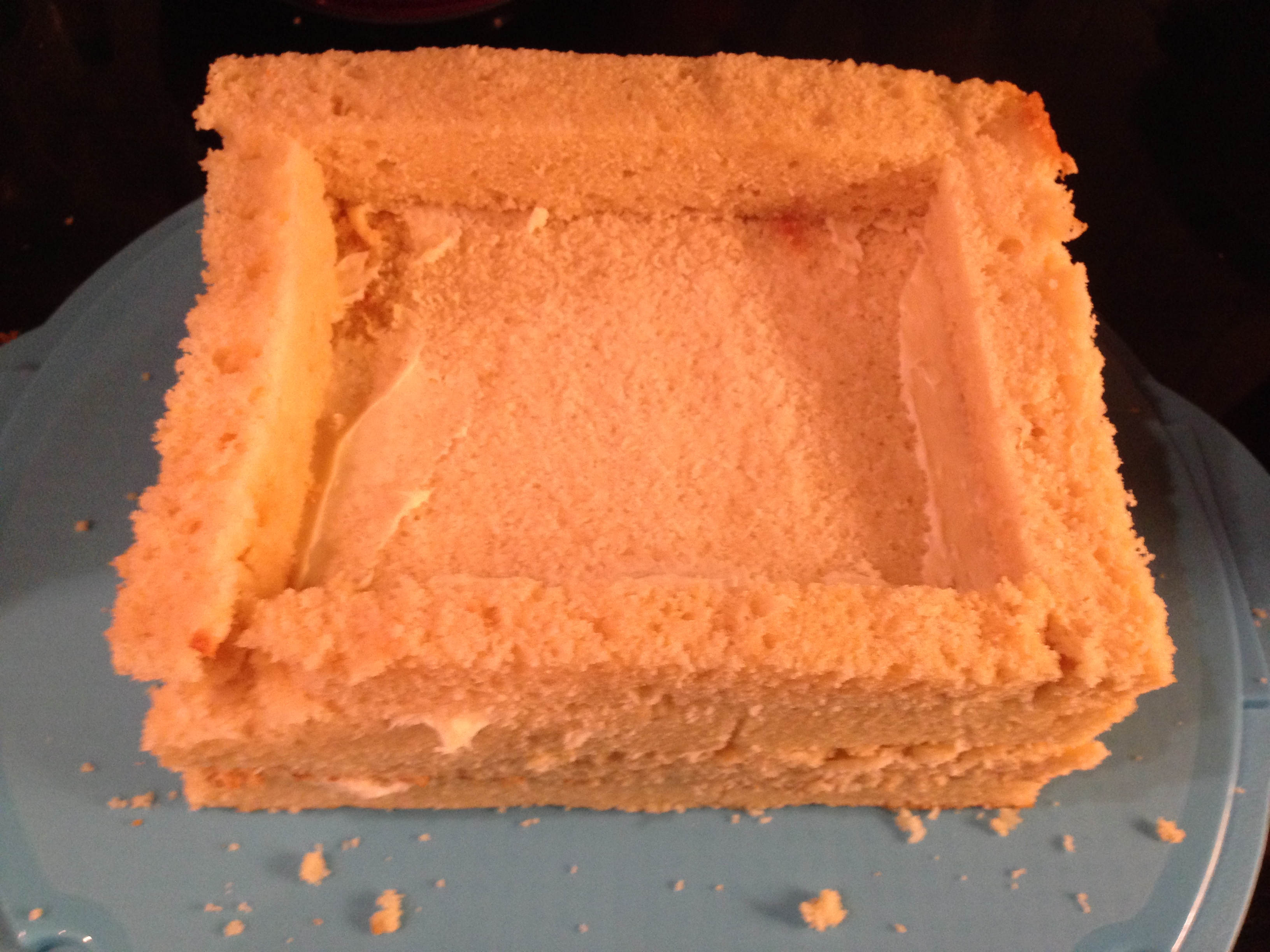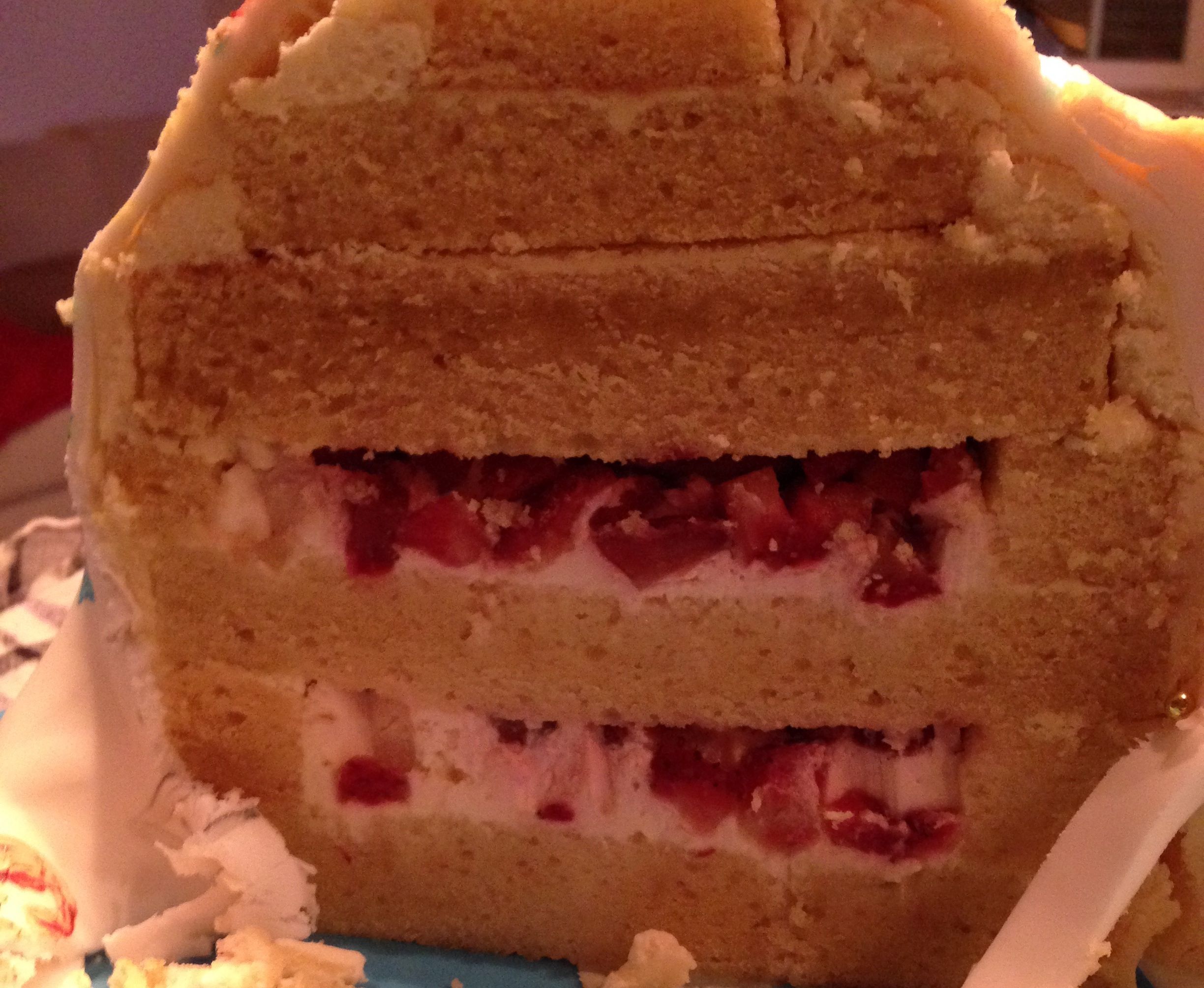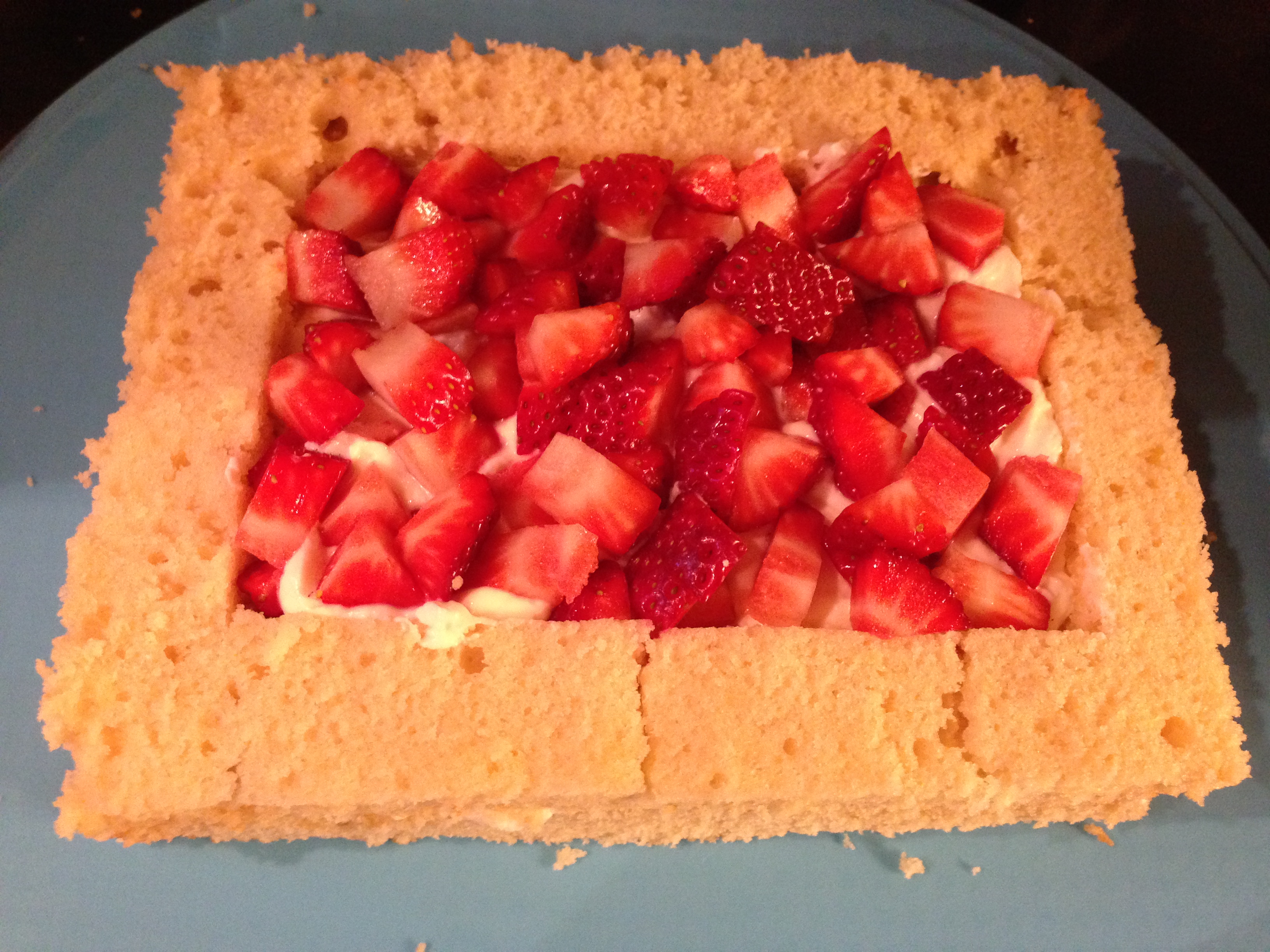 Der Boden ist ein Biskuitboden gefüllt mit zwei Fruchtschichten, die erste bestehend aus Erdbeeren & Himbeeren; die zweite aus Mandarinen & Ananas, dazwischen ist eine Frischkäse-Sahne-Creme. Die Schokoladenbuttercreme besteht aus Weißer Schokolade, Sahne, Butter, Puderzucker und grüner Lebensmittelfarbe, gespritzt mit einer Grastülle/Mehrlochtülle. Die Veilchen und Schmetterlinge sind aus Blütenpaste gefertigt und bemalt.